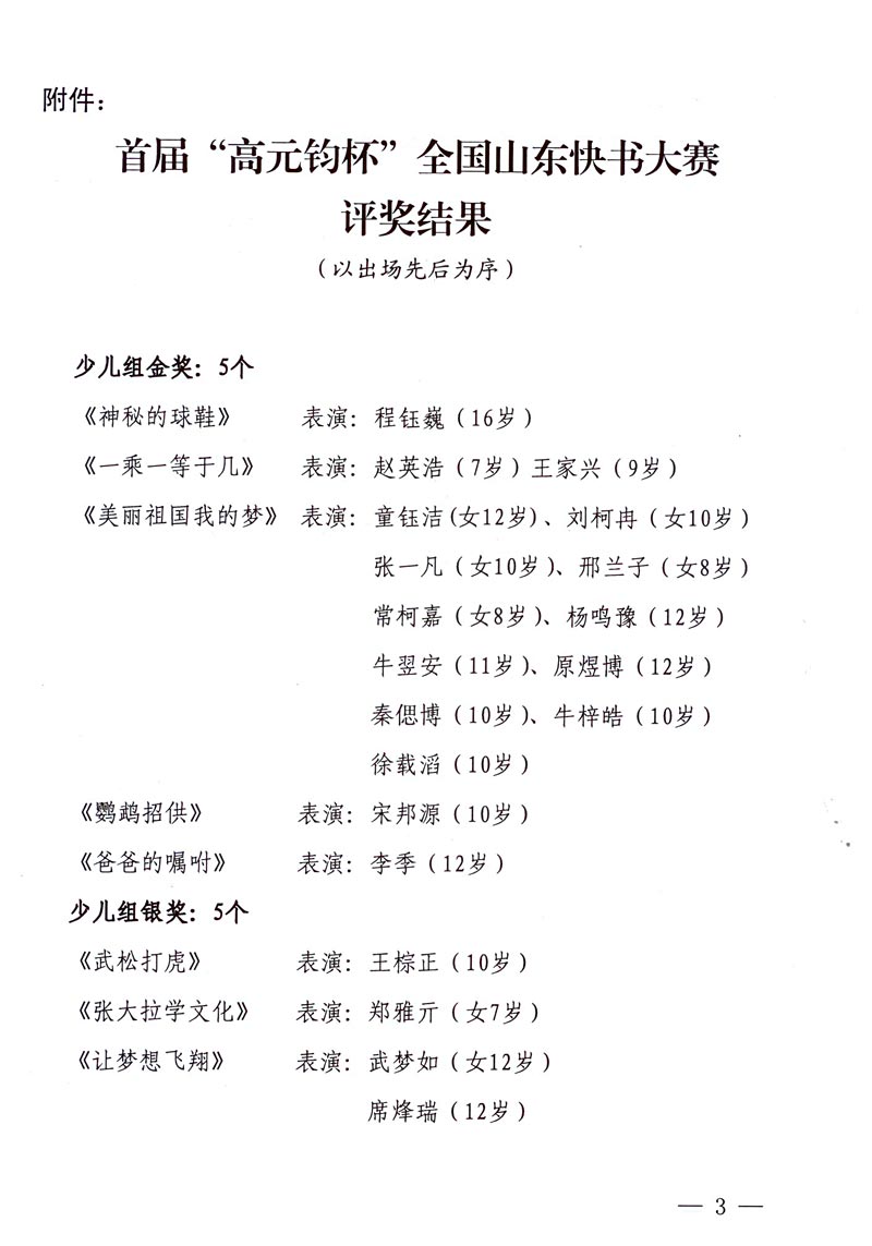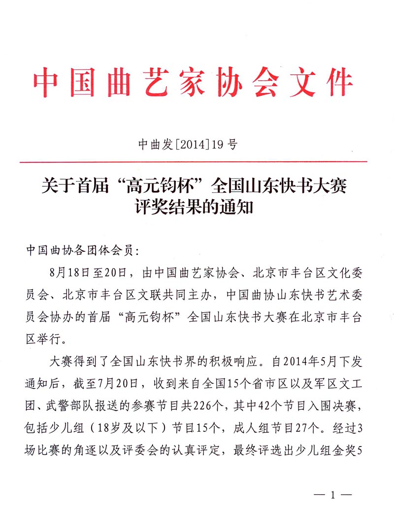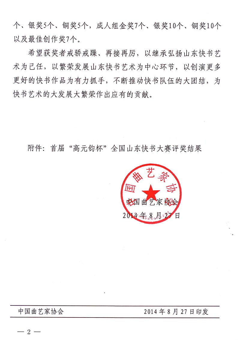 中國曲協(xié):關(guān)于首屆“高元均杯”全國山東快書大賽評獎(jiǎng)結(jié)果的通知 來源:中國曲協(xié) 作者:中國曲協(xié) 時(shí)間:2014-09-12 【字體:小 大】 分享到: 【打印正文】