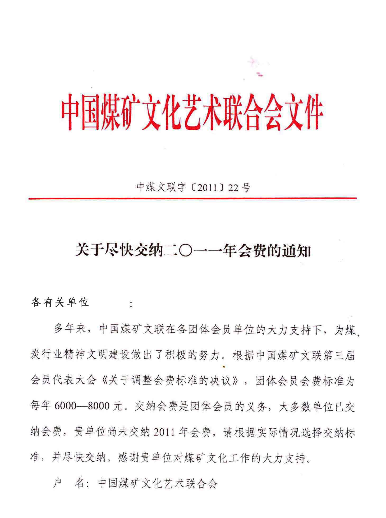 關(guān)于盡快交納二〇一一年會(huì)費(fèi)的通知 來源:中國煤礦文化網(wǎng) 作者:煤礦文聯(lián) 時(shí)間:2011-12-22 【字體:小 大】 分享到: 【打印正文】