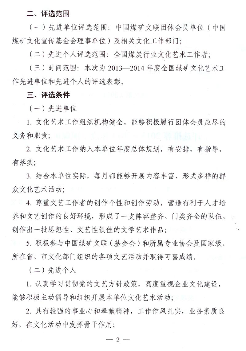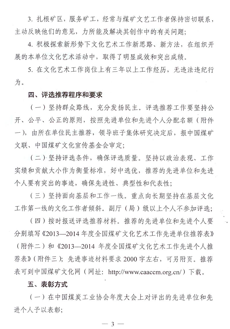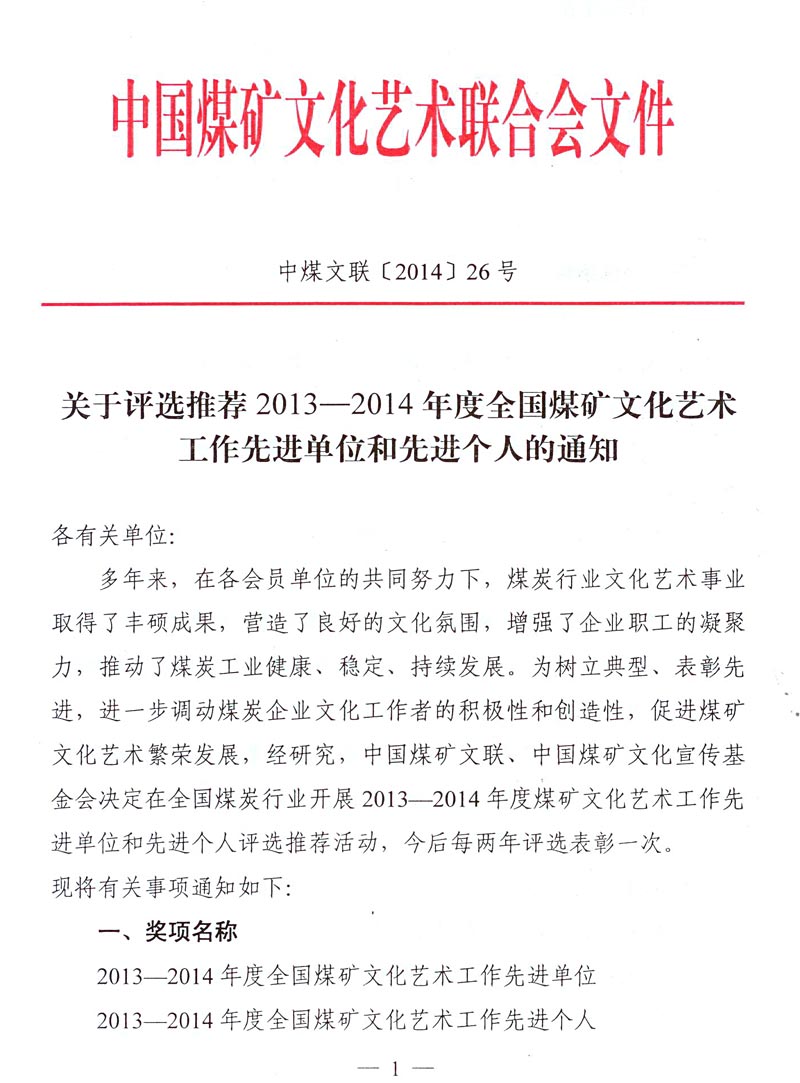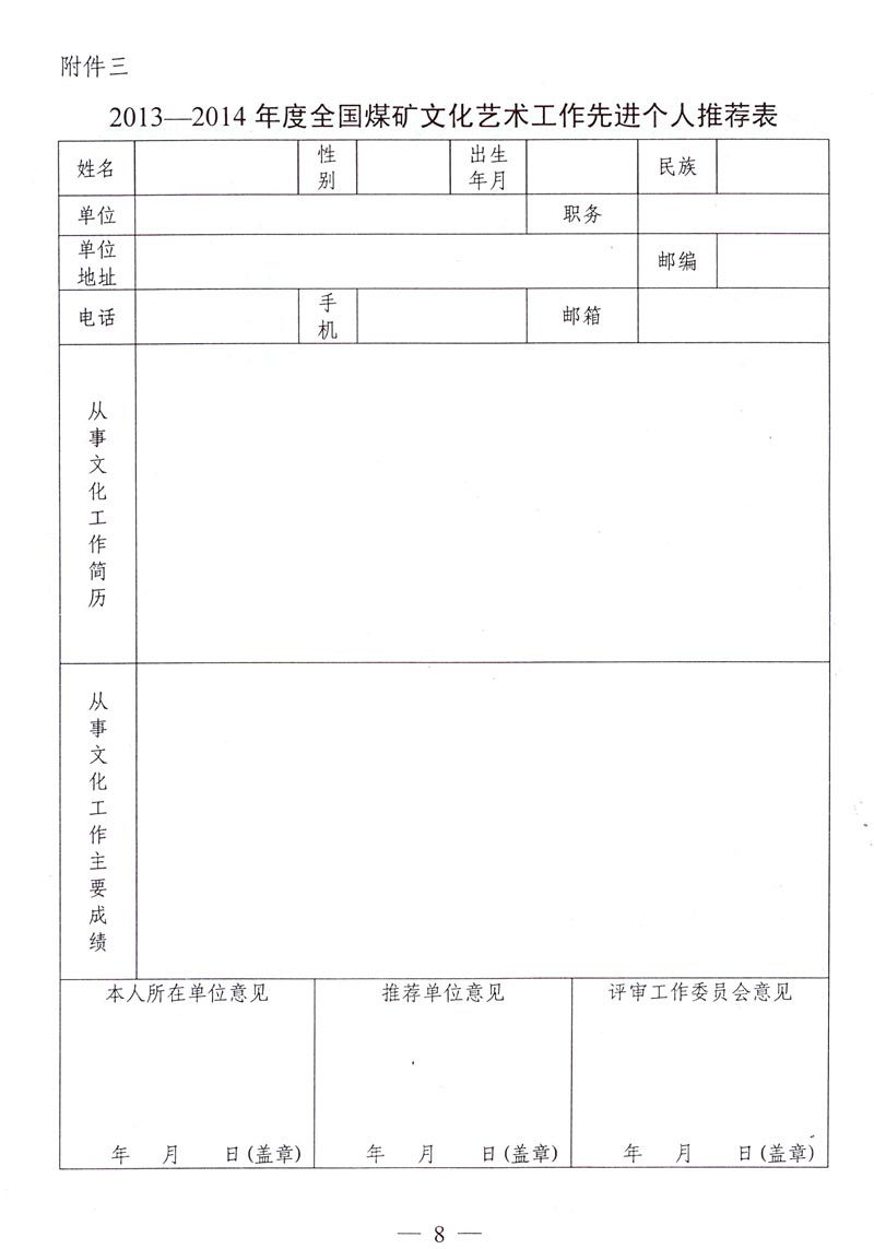 關(guān)于評(píng)選推薦2013—2014年度全國(guó)煤礦文化藝術(shù)工作先進(jìn)單位和先進(jìn)個(gè)人的通知 來(lái)源: 作者: 時(shí)間:2014-11-21 【字體:小 大】 附件下載: 附件一:2013—2014年度全國(guó)煤礦文化藝術(shù)工作先進(jìn)單位和先進(jìn)個(gè)人名額分配表 附件二:2013—2014年度全國(guó)煤礦文化藝術(shù)工作先進(jìn)單位推薦表 附件三:2013—2014年度全國(guó)煤礦文化藝術(shù)工作先進(jìn)個(gè)人推薦表 智能標(biāo)簽: 全國(guó)煤礦 文化藝術(shù)工作 先進(jìn)單位 先進(jìn)個(gè)人 相關(guān)內(nèi)容 分享到: 【打印正文】