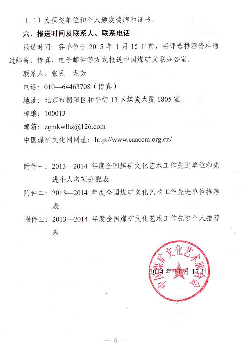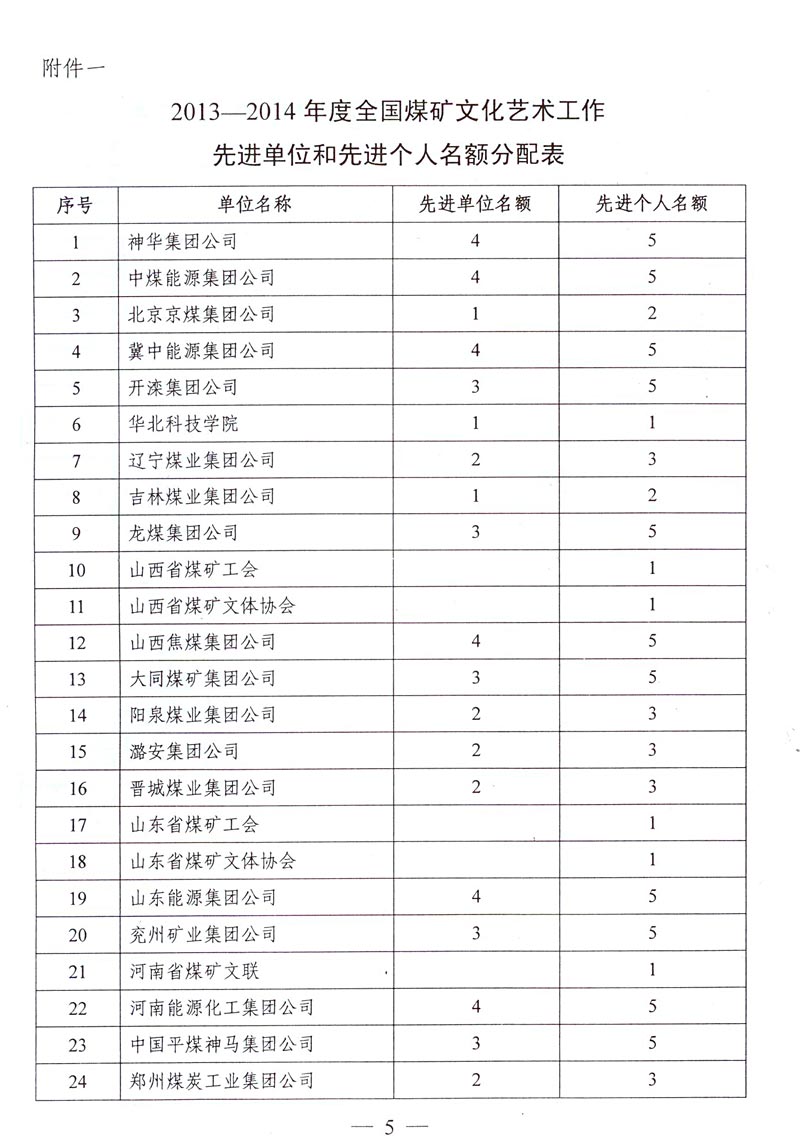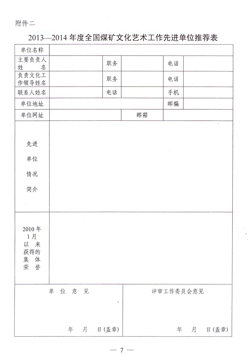 關(guān)于評(píng)選推薦2013—2014年度全國(guó)煤礦文化藝術(shù)工作先進(jìn)單位和先進(jìn)個(gè)人的通知 來(lái)源: 作者: 時(shí)間:2014-11-21 【字體:小 大】 附件下載: 附件一:2013—2014年度全國(guó)煤礦文化藝術(shù)工作先進(jìn)單位和先進(jìn)個(gè)人名額分配表 附件二:2013—2014年度全國(guó)煤礦文化藝術(shù)工作先進(jìn)單位推薦表 附件三:2013—2014年度全國(guó)煤礦文化藝術(shù)工作先進(jìn)個(gè)人推薦表 智能標(biāo)簽: 全國(guó)煤礦 文化藝術(shù)工作 先進(jìn)單位 先進(jìn)個(gè)人 相關(guān)內(nèi)容 分享到: 【打印正文】