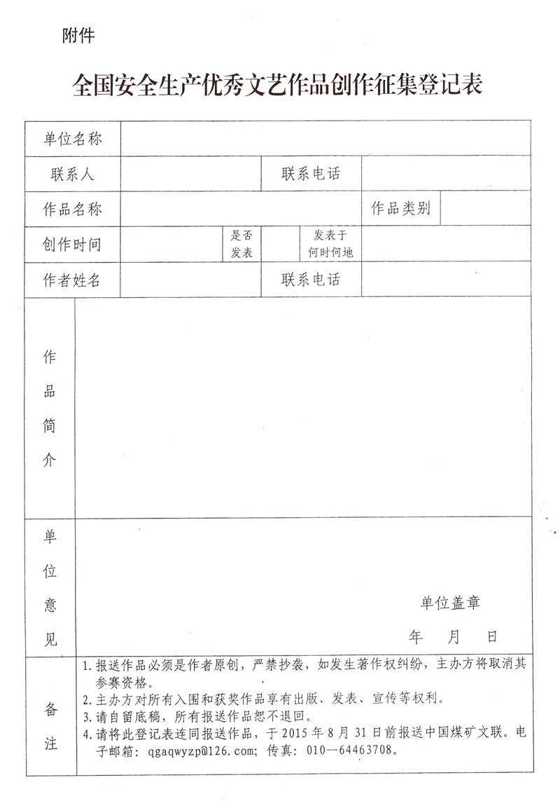 登記表下載:全國安全生產(chǎn)優(yōu)秀文藝作品創(chuàng)作征集登記表