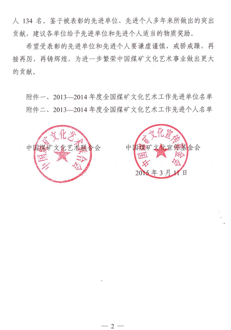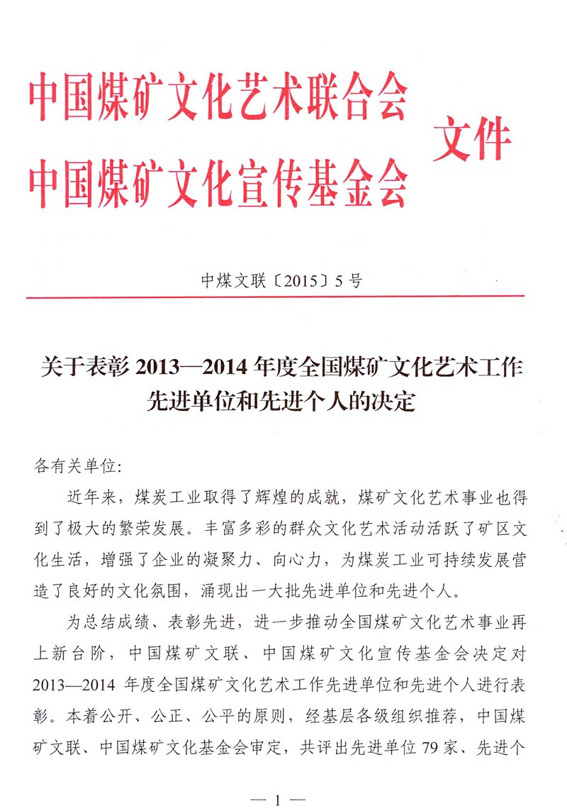 關(guān)于表彰2013—2014年度全國(guó)煤礦文化藝術(shù)工作先進(jìn)單位和先進(jìn)個(gè)人的決定 來(lái)源: 作者: 時(shí)間:2015-03-19 【字體:小 大】 附件一:2013—2014年度全國(guó)煤礦文化藝術(shù)工作先進(jìn)單位名單 附件二:2013—2014年度全國(guó)煤礦文化藝術(shù)工作先進(jìn)個(gè)人名單 智能標(biāo)簽: 煤礦文化藝術(shù) 先進(jìn)單位 先進(jìn)個(gè)人 相關(guān)內(nèi)容 分享到: 【打印正文】