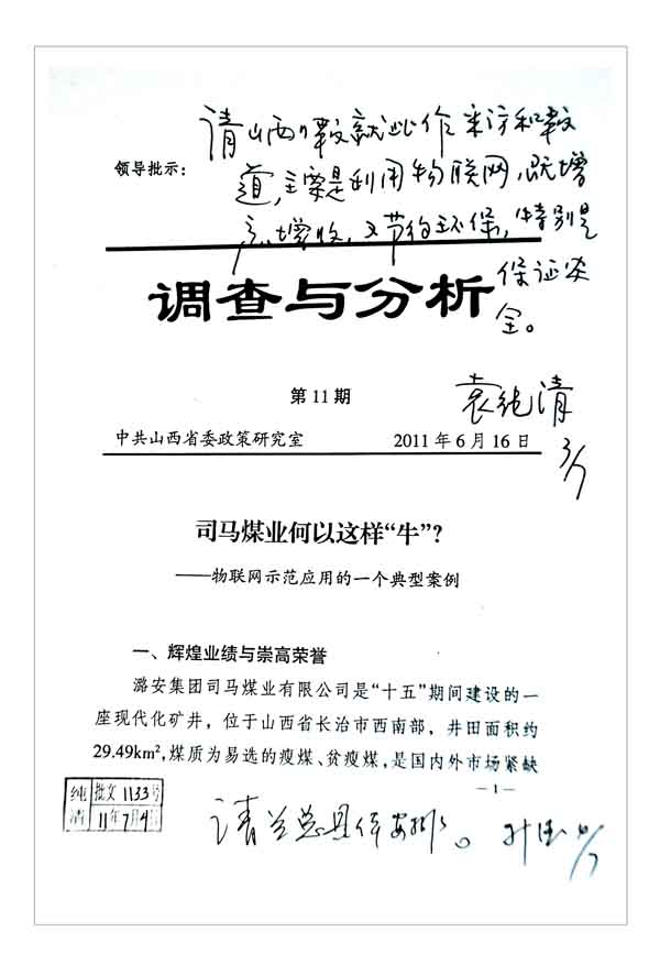 2011年4月,山西省委書記袁純清對司馬煤業的物聯網技術做出重要批示:“請《山西日報》就此作采訪和報道,主要是利用物聯網,既增產增效,又節約環保,特別是保證安全?!?月,《山西日報》頭版頭條刊發長篇通訊《司馬奇跡》,全面介紹了司馬煤業的物聯網技術,“司馬奇跡”由此得名。