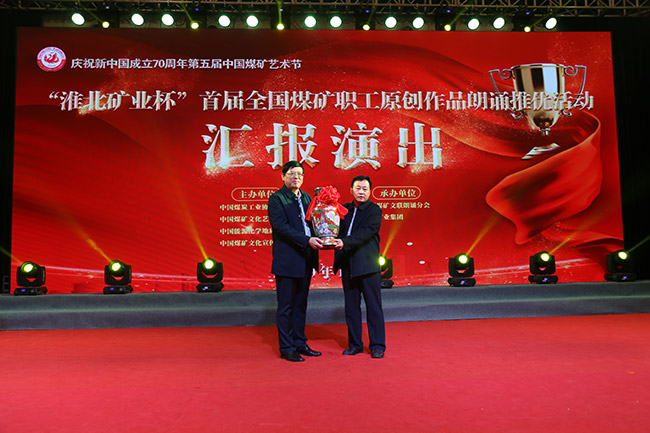 匯報演出前,張強向活動承辦單位淮北礦業集團贈送了第五屆中國煤礦藝術節“特別貢獻獎”杯。