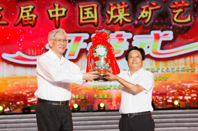 梁嘉琨(左)代表藝術(shù)節(jié)組委會(huì)向開(kāi)灤集團(tuán)頒發(fā)第五屆中國(guó)煤礦藝術(shù)節(jié)特別貢獻(xiàn)獎(jiǎng)