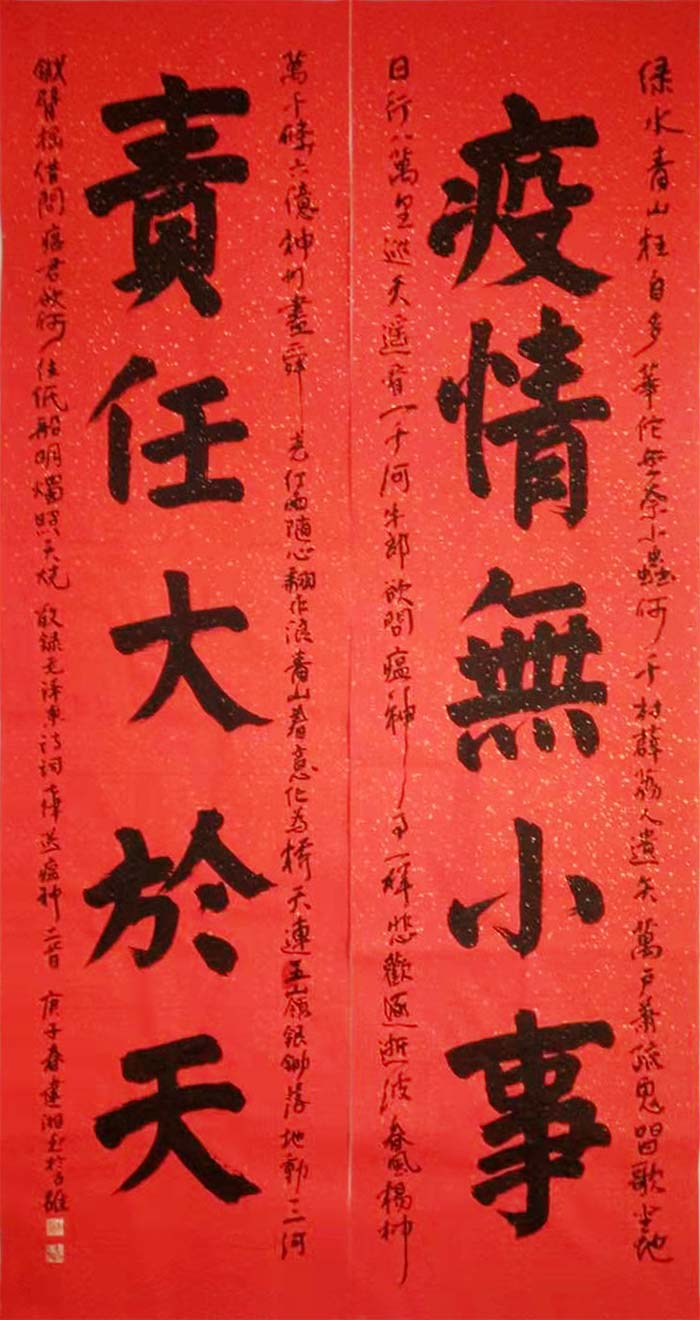 本次“生命重于泰山——中國煤礦書法家聲援武漢、抗擊疫情網絡書法展”就是從這些作品中遴選出來的佳作精品,以此獻給所有奮戰在抗擊新型冠狀病毒感染的肺炎疫情第一線的勇士們。最偉大的力量,莫過于人心的力量,讓我們一同團結起來,打贏這場疫情防控的硬仗。