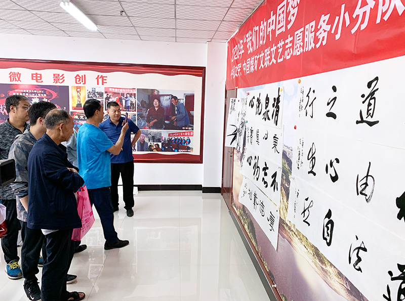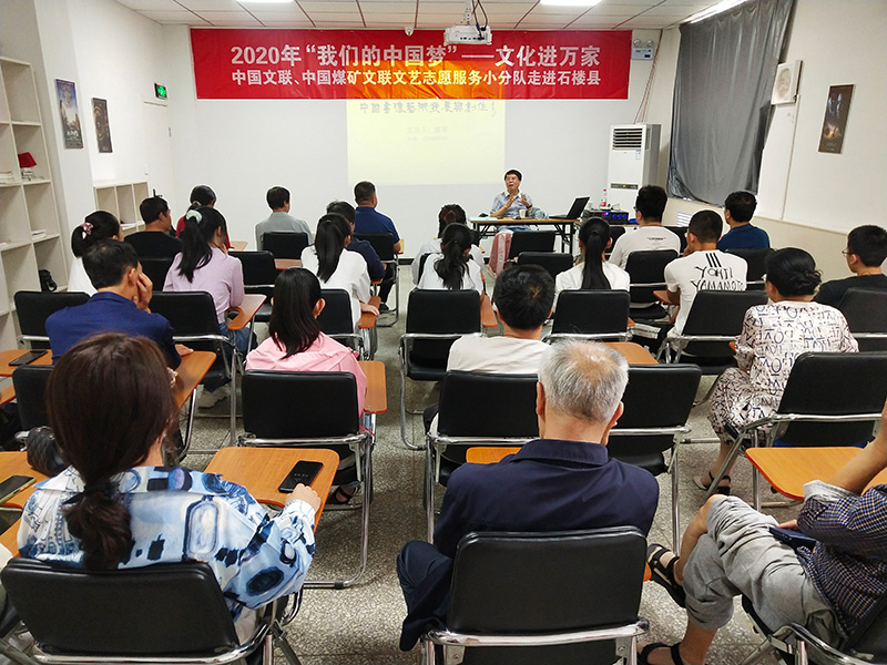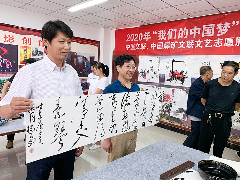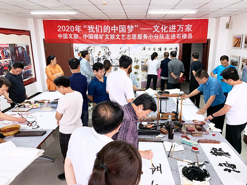 8月16日至19日,中國文聯、中國煤礦文聯文藝志愿服務小分隊走進石樓縣開展2020年“我們的中國夢”——文化進萬家活動。中國煤礦文聯秘書長、中國煤礦文聯志愿者協會主席盛軍帶隊,中國煤礦文聯宣傳處處長、中國煤礦文聯志愿者協會秘書長辛凡忠,中國煤礦文聯書協副主席馬銘、楊玉劍,副秘書長侯建偉,理事傅澍乾;中國煤礦文聯美協理事馬鳳山、周先寶、侯平遠、梁志強等煤礦書法美術家參加文藝志愿服務。活動期間,小分隊先后在義牒鎮褚家峪村、石樓縣文化大樓和精石文化培訓中心進行書畫作品贈送、現場創作、書法講座和書畫作品點評輔導等,受到廣大群眾的熱烈歡迎。